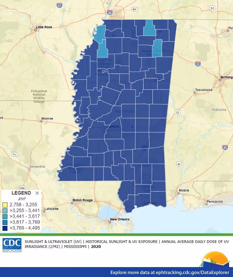 According to the CDC, the Greenville area, and the state of Mississippi in general, has Average Daily Dose of Ultraviolet (UV) light on the higher end of their scale vs. other states in the continental United States.