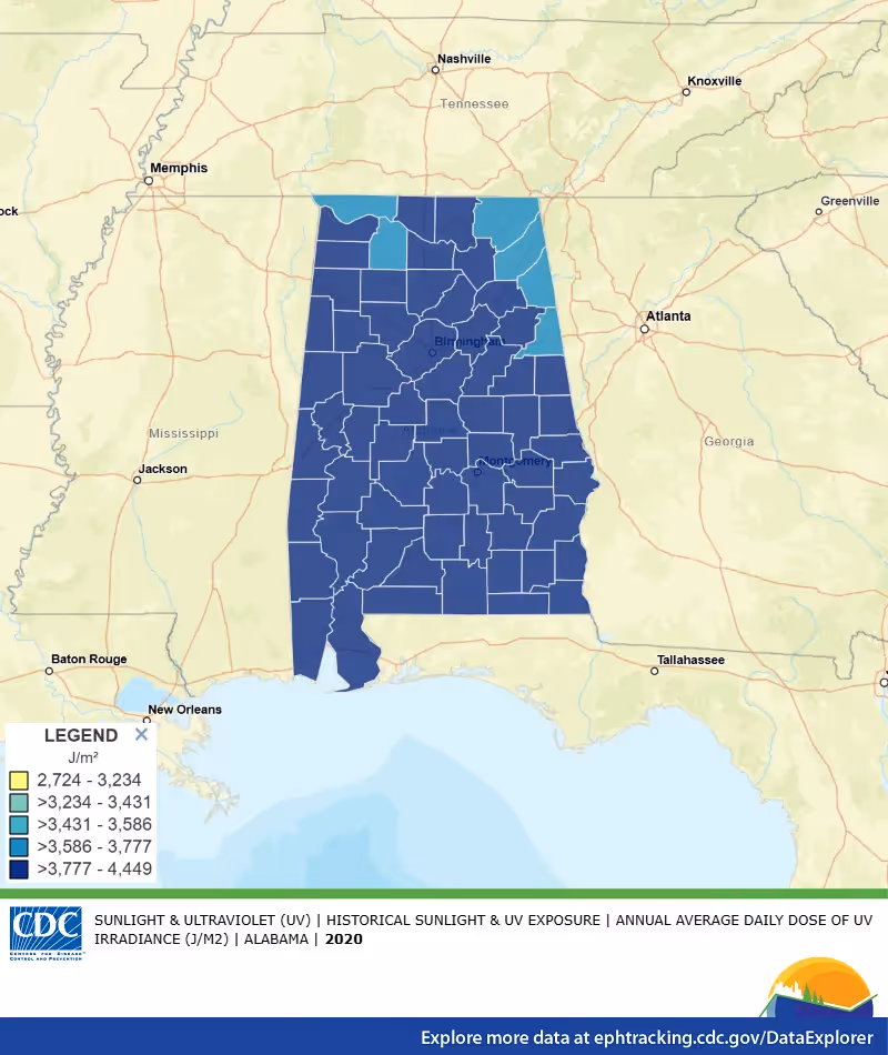 According to the CDC, the Mobile area, and the state of Alabama in general, has Average Daily Dose of Ultraviolet (UV) light on the higher end of their scale vs. other states in the continental United States.